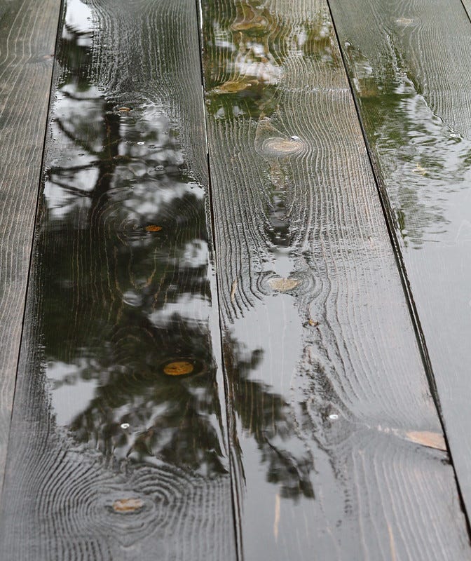 I wipe puddles off the porch furniture For I have come here to rock, and to write Carving a way through the thick morning air Careful not to slip on slick, slimy boards I have come here to rock, and to write And instead pry pink fungus off the railing Careful not to slip on slick, slimy boards Yet beads glinting on a wire catch my eye Hands instead pry pink fungus off the railing Dump the drip trays from my potted plants Yet beads glinting on a wire catch my eye A breeze sends down a wave of rain Dumps into the drip trays from my potted plants Splattering my notebook, triggering freeze A breeze sends down a raining wave Of internal alarms, encoded by neurons Splatters in my notebook, triggering freeze Slow down, dear one, it’s only wet leaves These internal alarms, encoded by neurons Like a dog shaking dry after a swim Slow down, dear one, it’s only wet leaves How many times will we wring ourselves out? Shake dry like a dog after a swim? Will we always be able to begin again? How many times will we wring ourselves out? Carving a way through the thick morning air Will we always be able to begin again– To wipe puddles off the porch furniture? I have come here to rock, and to write.